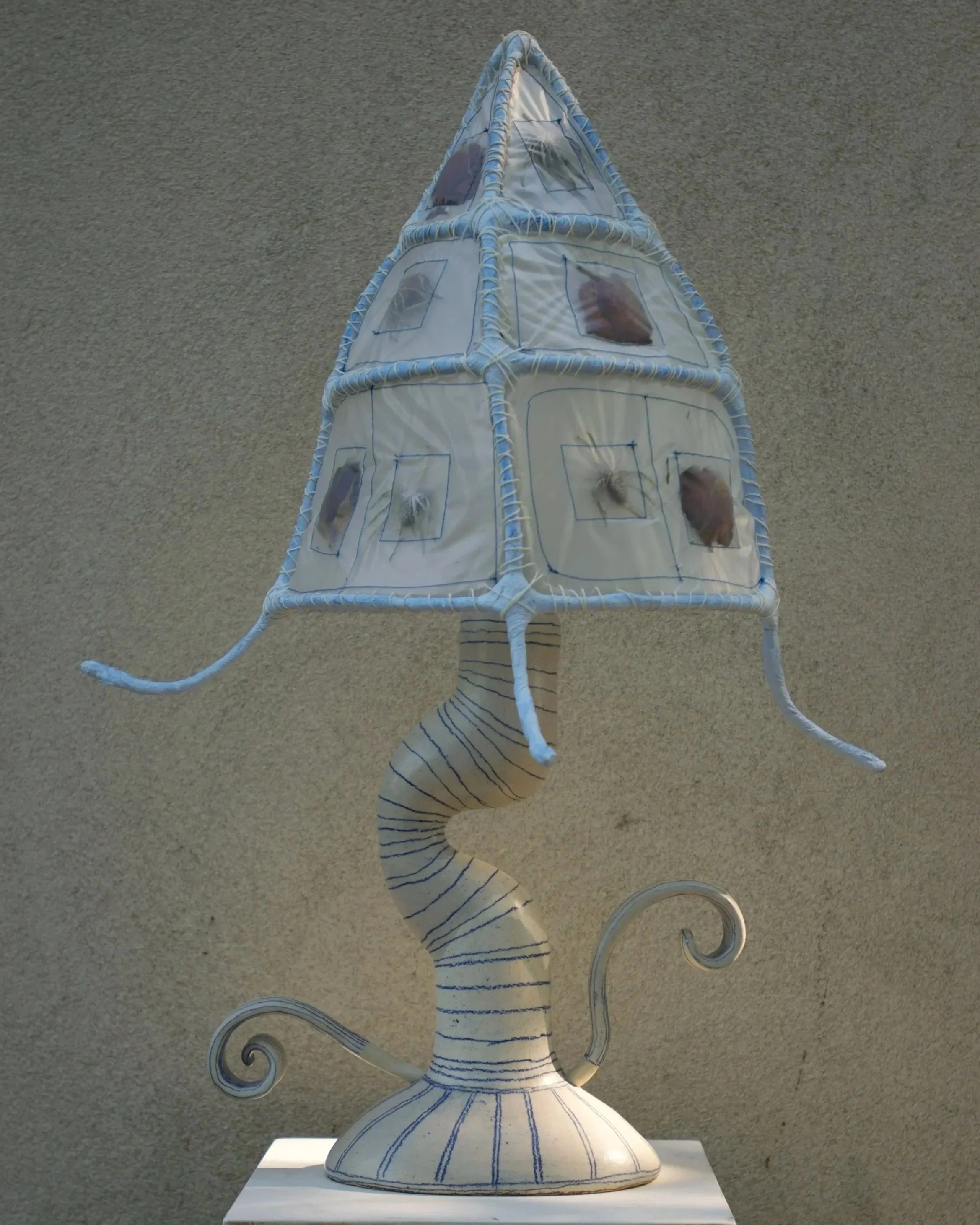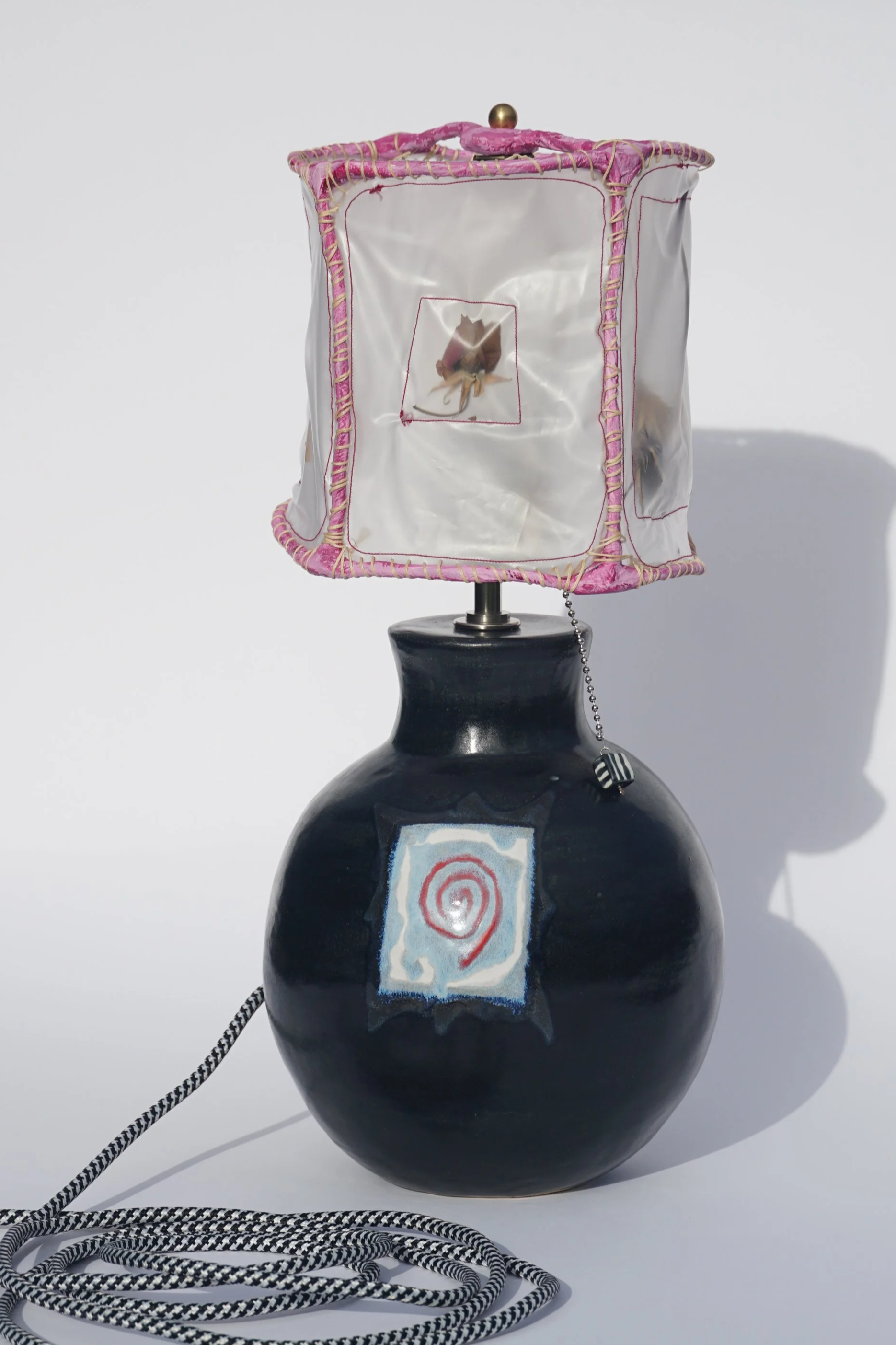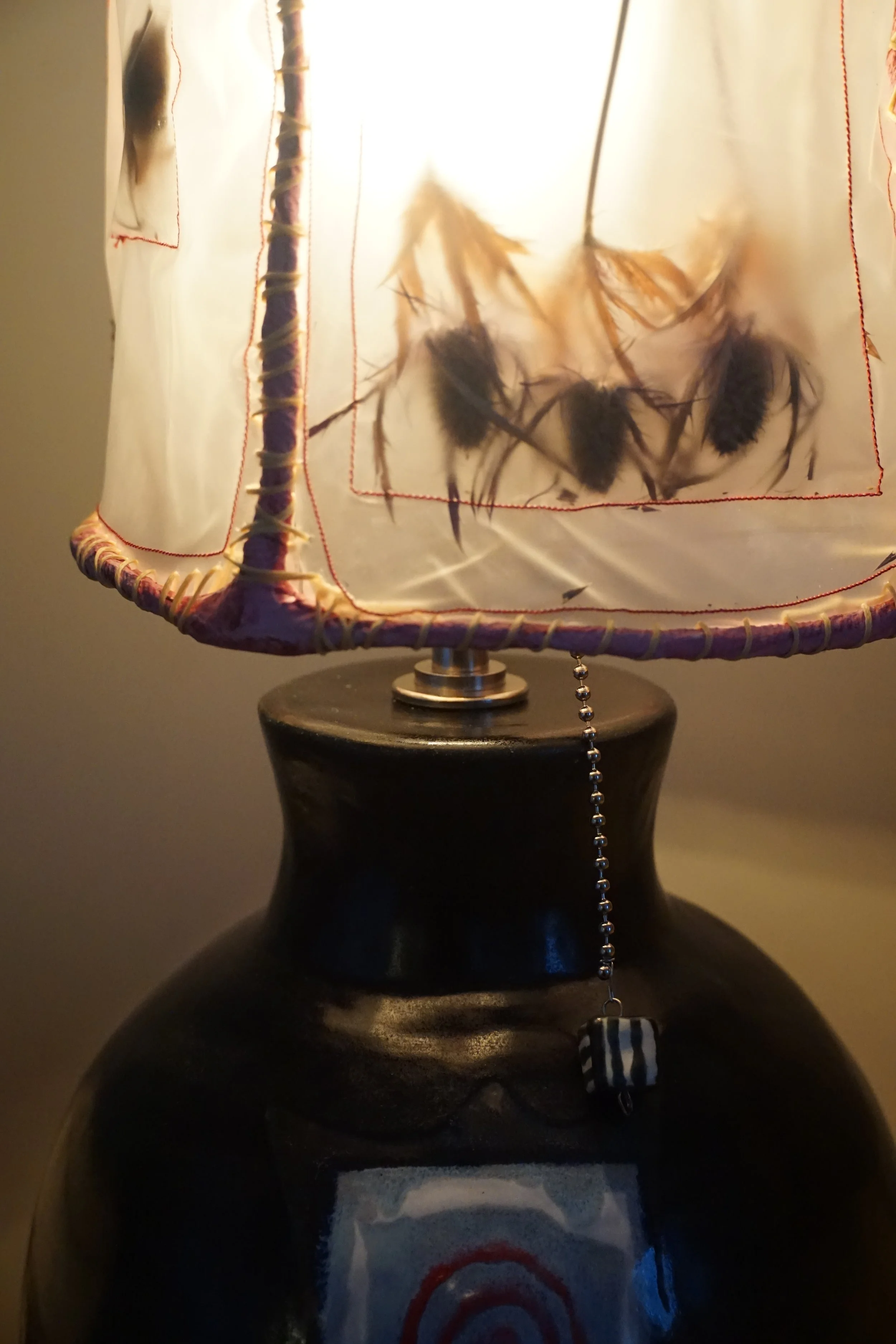Bases made by Miranda Karson: Each lamp base is formed by hand using a combination of rolling, pinching, and coiling techniques developed over years in my sculptural work. The clay body is a cream colored mid-range stoneware with just a hint of sandy texture. Each glaze is brushed on and fired to a matte or satin finish, so that the light they reflect is soft and warm.