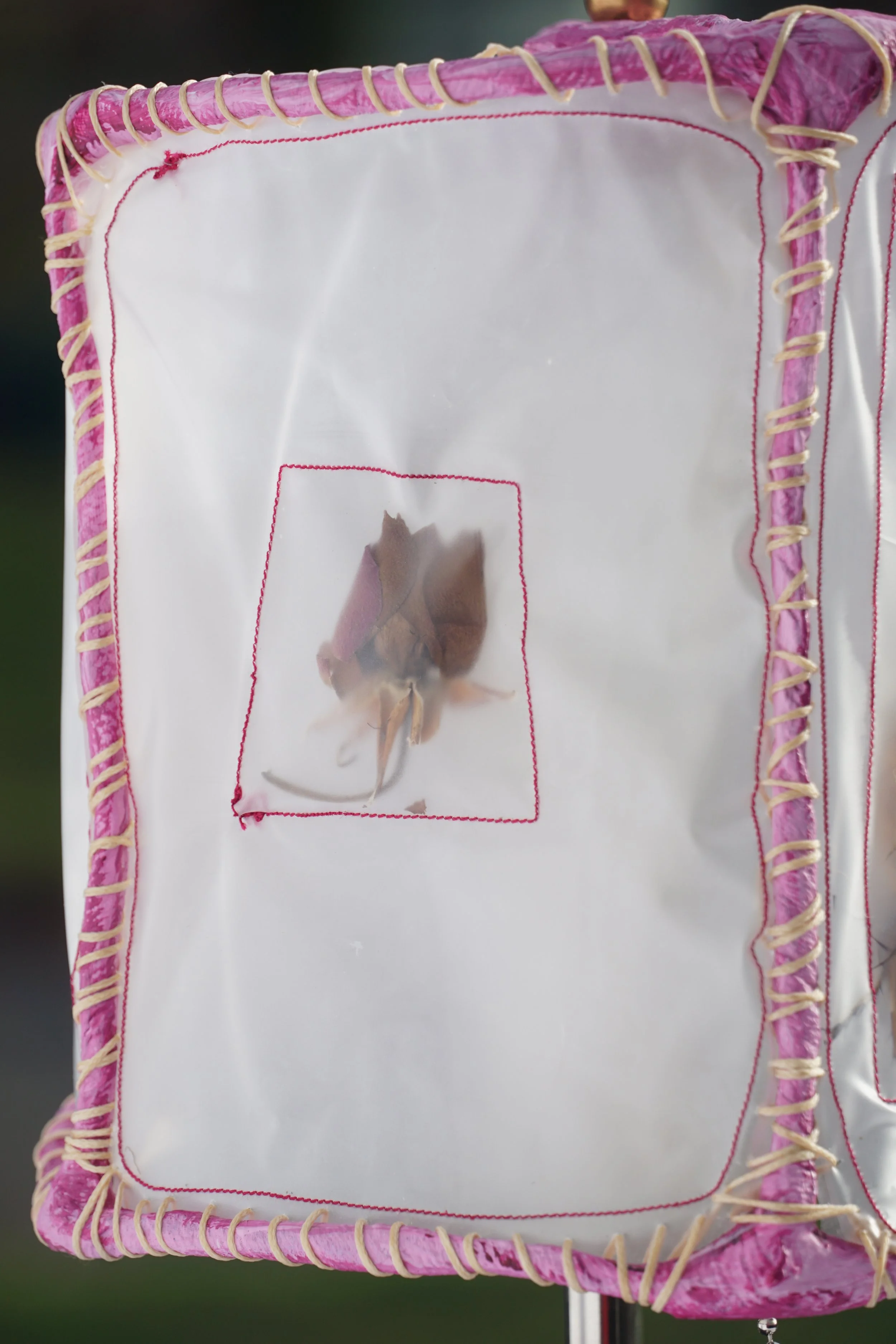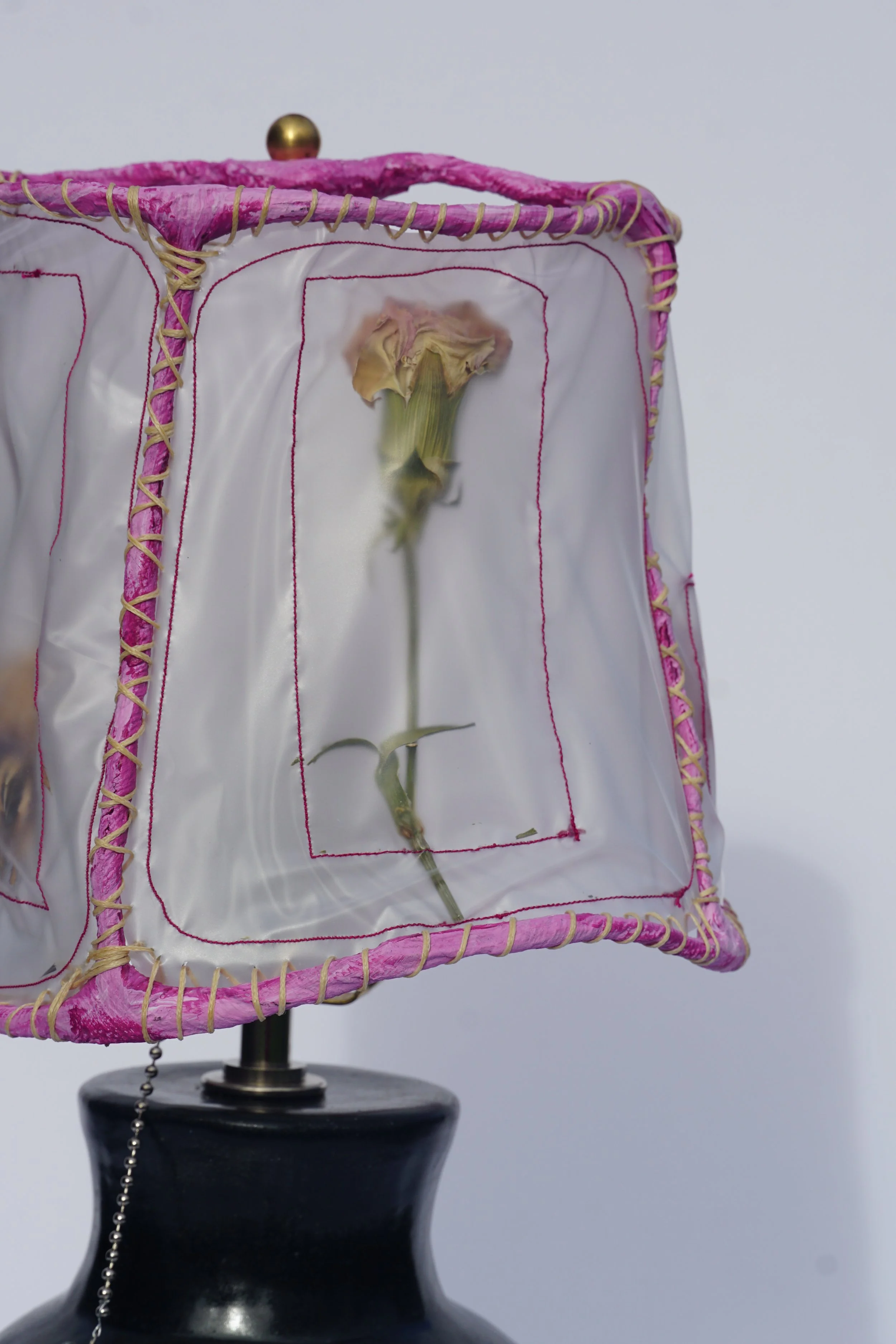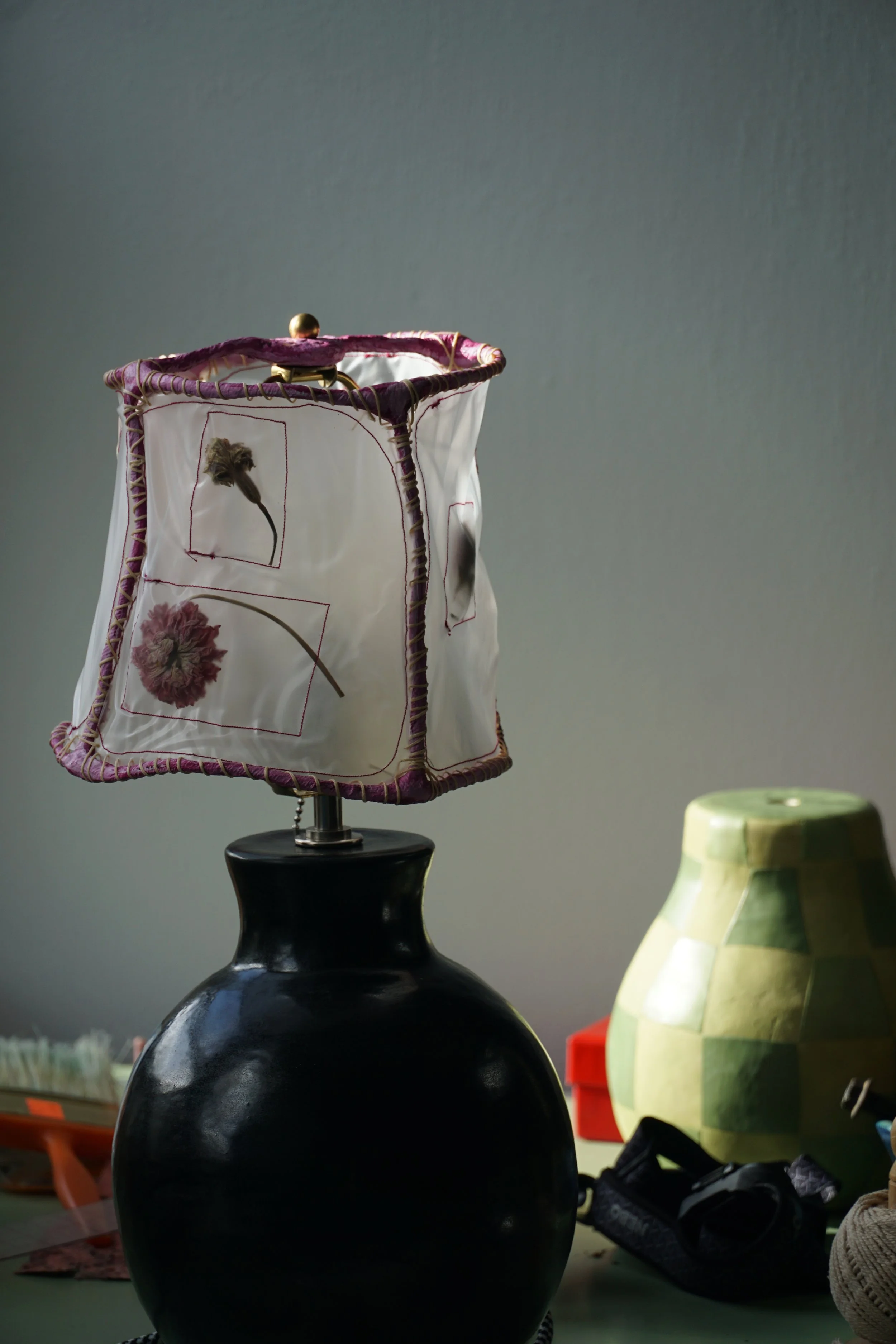 Shades made by Phoebe Mol: Each lamp shade is a convergence of many materials and timelines, as polyvinyl panels enveloping dried flowers collected over years are hand-sewn with waxed bookbinding thread onto paper mache armatures. The light casts sweet strange shadows of flowers you might meet in a dream.